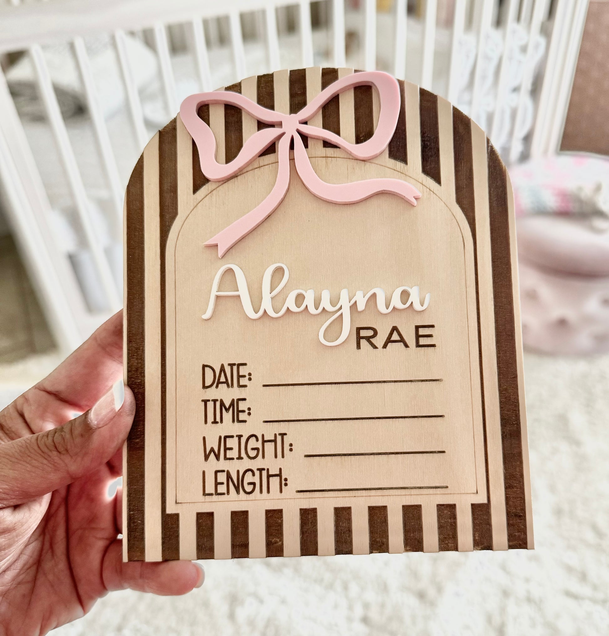 Middle name will be in all capital letters. First name & bow are laser cut Acrylic.