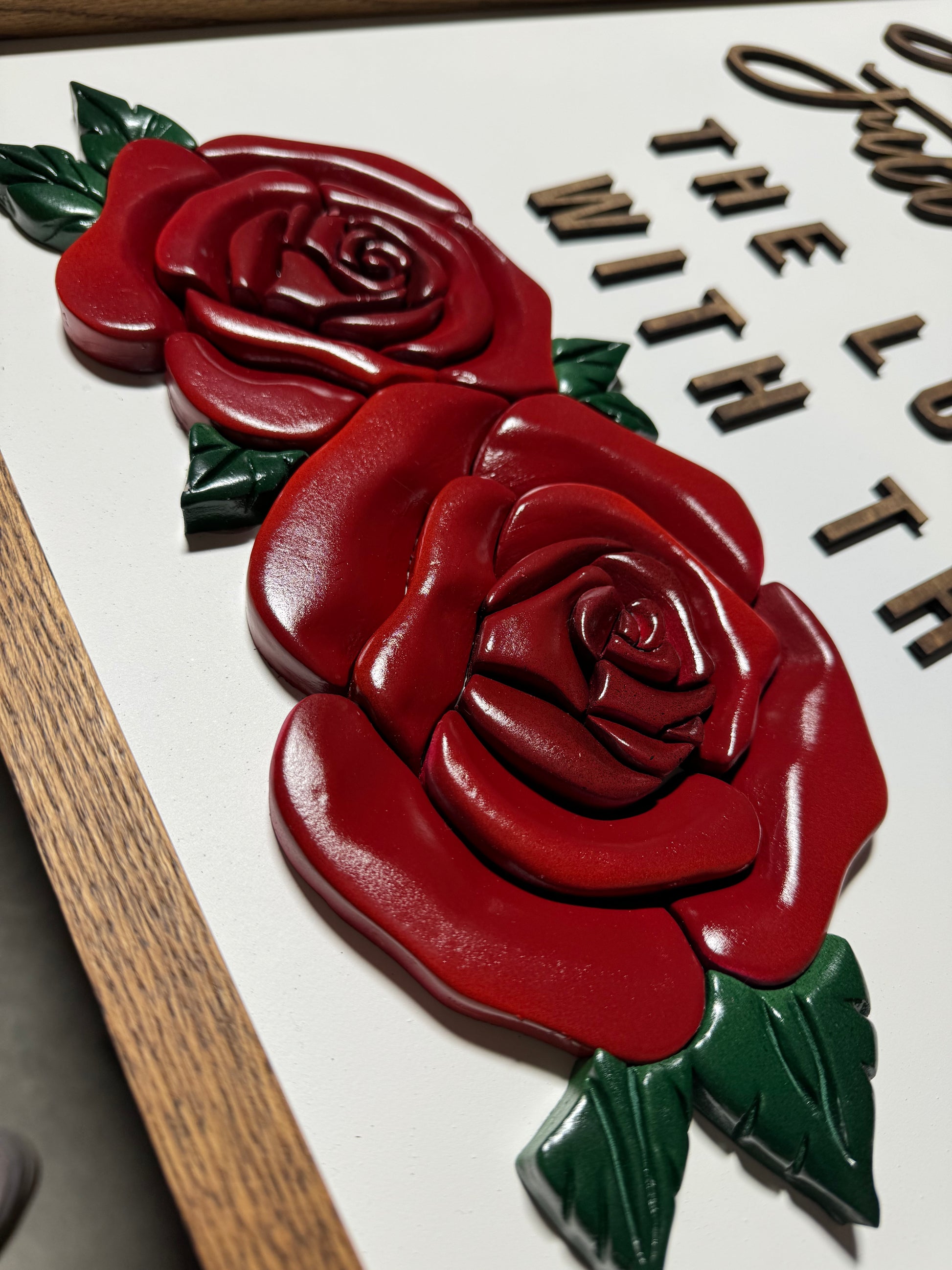 18x24 custom Wooden frame. 3D wooden letters & roses. Roses are hand shaped to add dimension. An heirloom sign for your home or a gift to someone special.