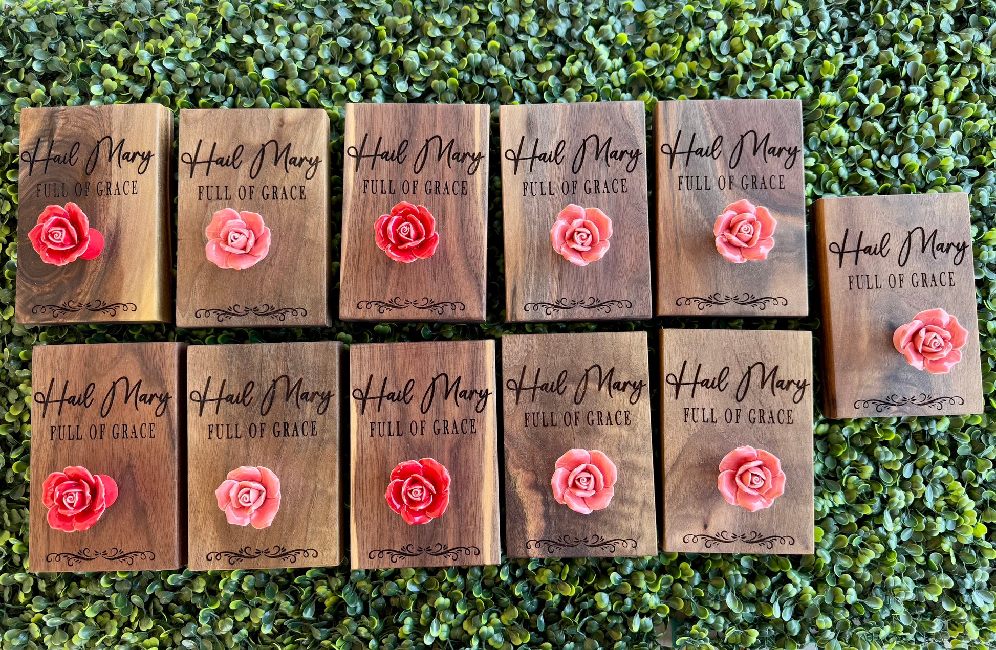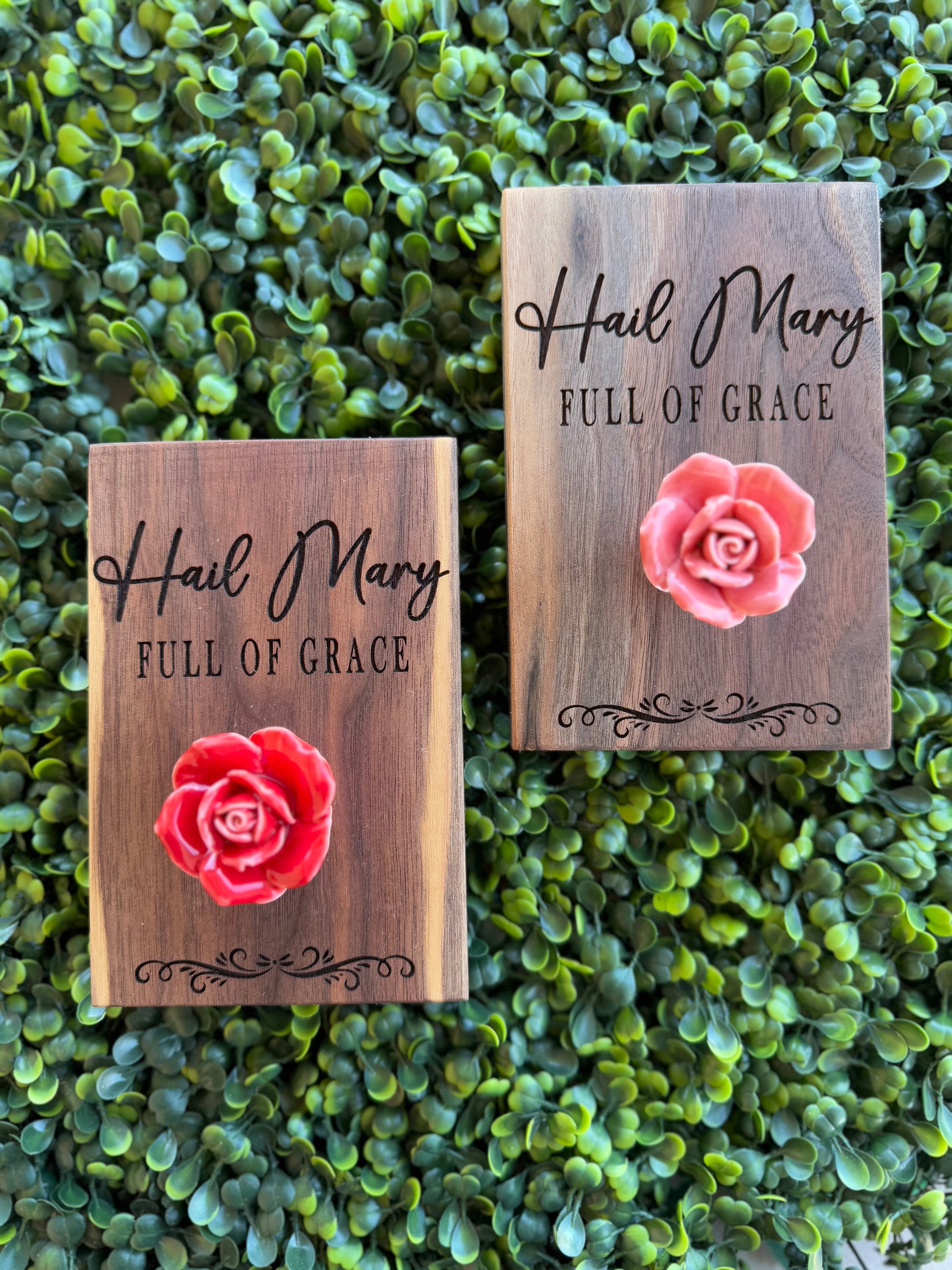 6x9 Rosary wooden holder. Features a red or pink rose knob to hang your beautiful rosaries. Hang on a wall in your home and or prayer room.