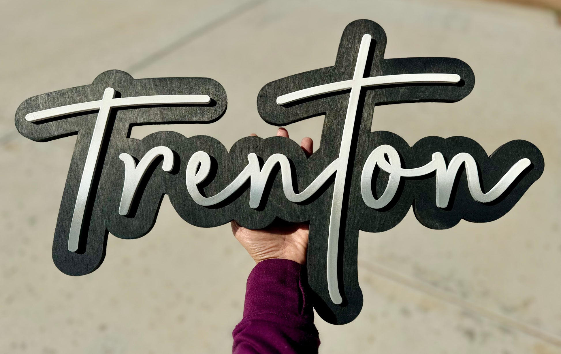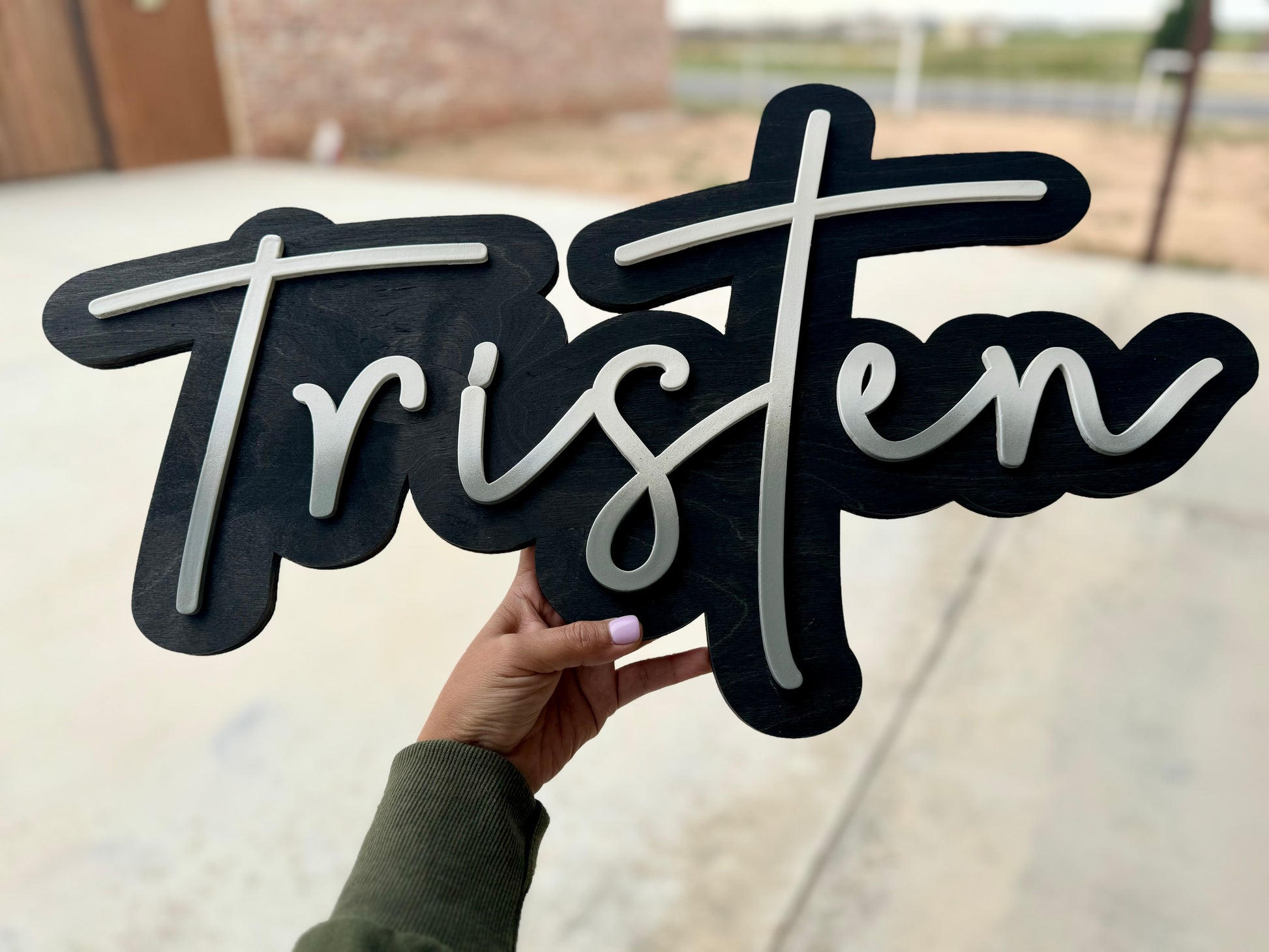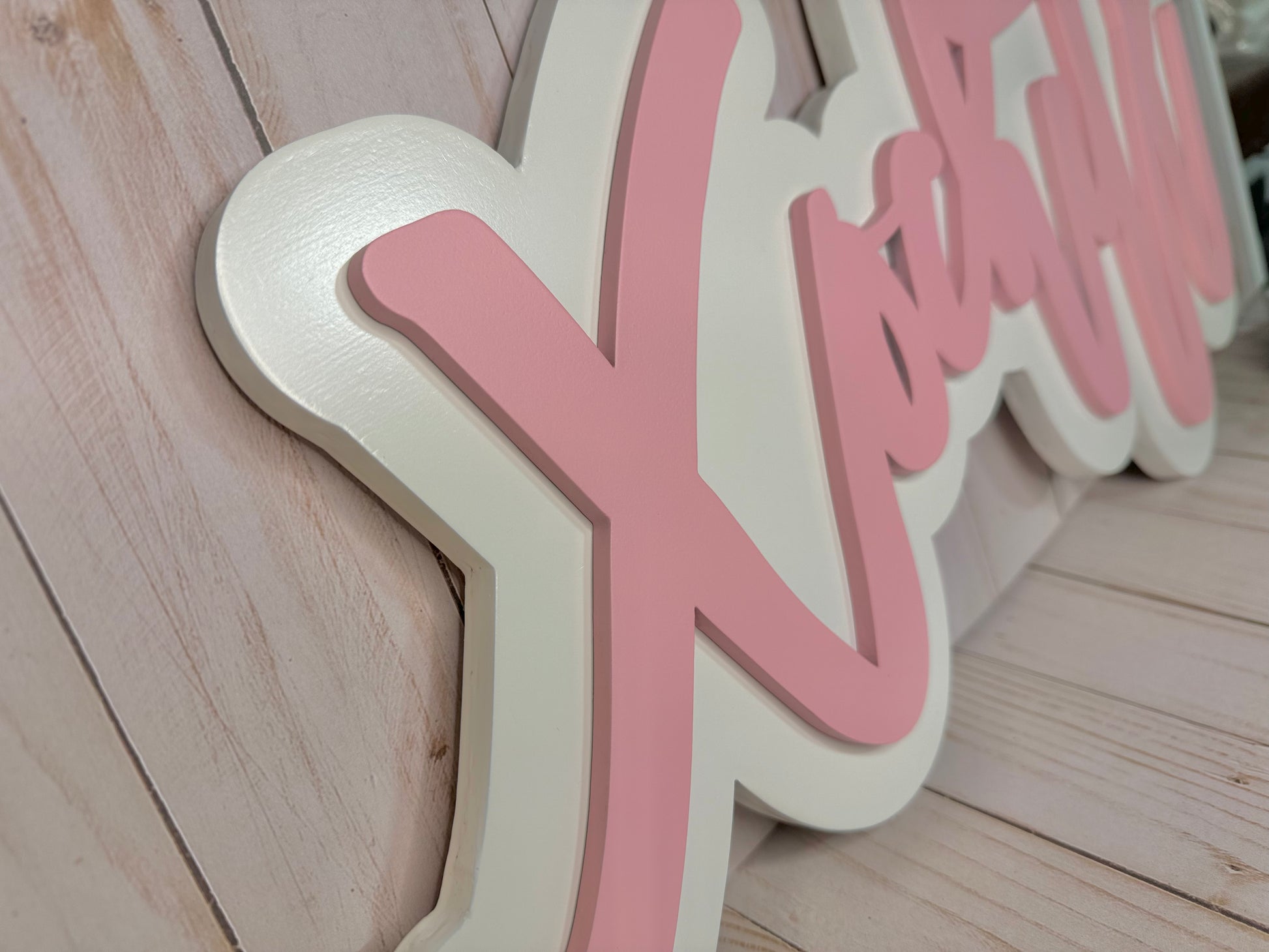 A beautiful Addition to a nursery or child’s room. 24” long and height varies with font used and letters in name. Sawtooth hanger added to back for easy hanging.